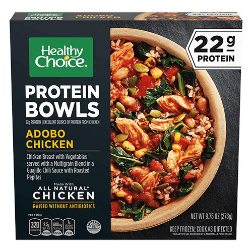 Try our healthy twist on a Southwestern dish with a Healthy Choice® Adobo Chicken Protein Bowl. Spicy Guajillo chili, fire-roasted corn, poblano peppers, and tomatoes on our seasoned all-natural* chicken (raised without antibiotics) combine with a wholesome mix of kale, spinach, red quinoa, and whole-grain rice for a deliciously easy meal. It's a tasty way to get fiber and 40% of your daily protein.