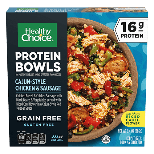 Spice things up with a Healthy Choice® Cajun-Style Chicken & Sausage Protein Bowl. Made with pulled all-natural* chicken breast, sliced chicken sausage, black beans, and vegetables, then combined with riced cauliflower and a spicy Cajun-style red pepper sauce. This bowl is ready in minutes, perfect for a no-prep lunch or busy weeknight dinner.