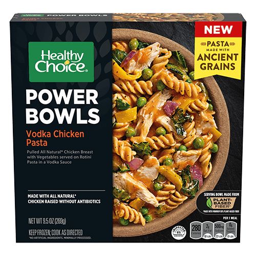 Fuel your day with Healthy Choice Power Bowls Vodka Chicken Pasta. This delicious prepared meal is filled with tender all natural* chicken breast raised without antibiotics with vegetables served on rotini pasta, all in a savory vodka sauce.