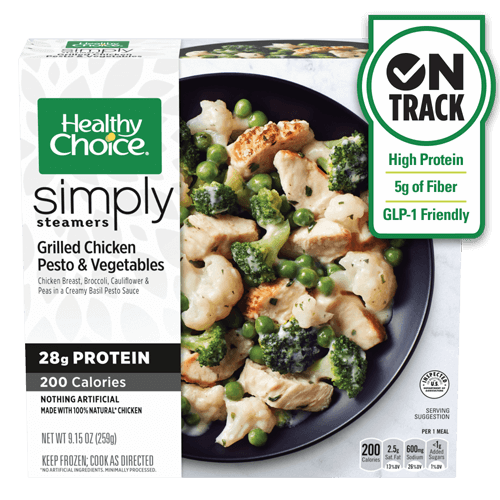 This flavorful dish combines 100% natural* chicken breast with broccoli, cauliflower, and peas, all topped off with a creamy basil pesto sauce.